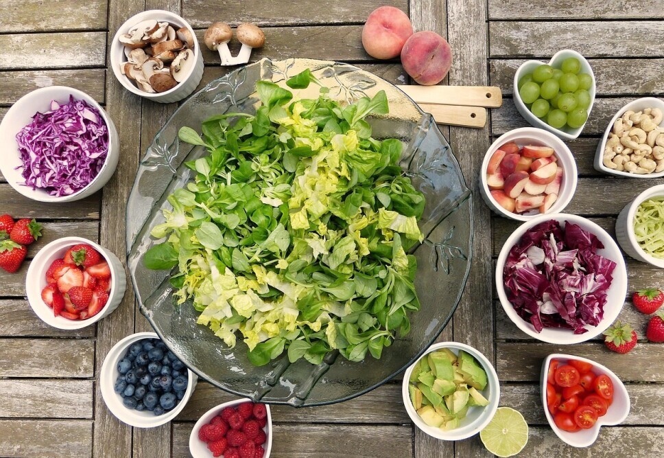 (A large bowl of lettuce and baby spinach surrounded by smaller bowls of fruit and veggies)