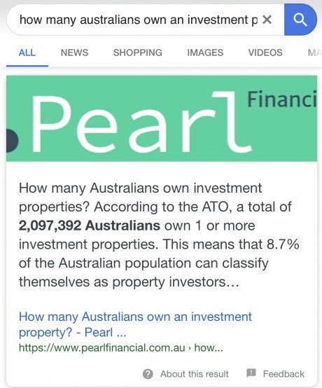 The query that my content was a featured snippet for is “how many Australians own an investments property?”