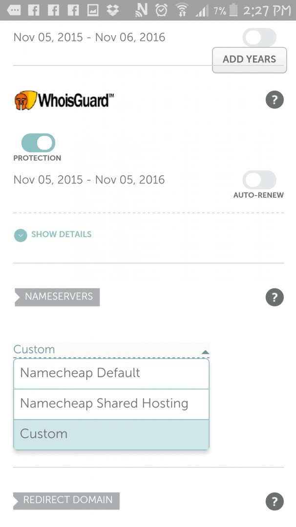 STEP 2: Scroll down to NAME SERVERS.There will be a drop down arrow which will give you 3 options:
