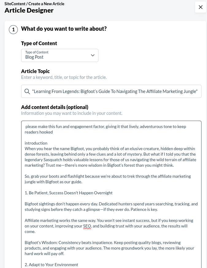 - Brainstorm 4 Titles: I choose 4 potential titles and test which one feels the most clickable. Sometimes, I use quirky ones like, “What Bigfoot Taught Me About Affiliate Marketing.”