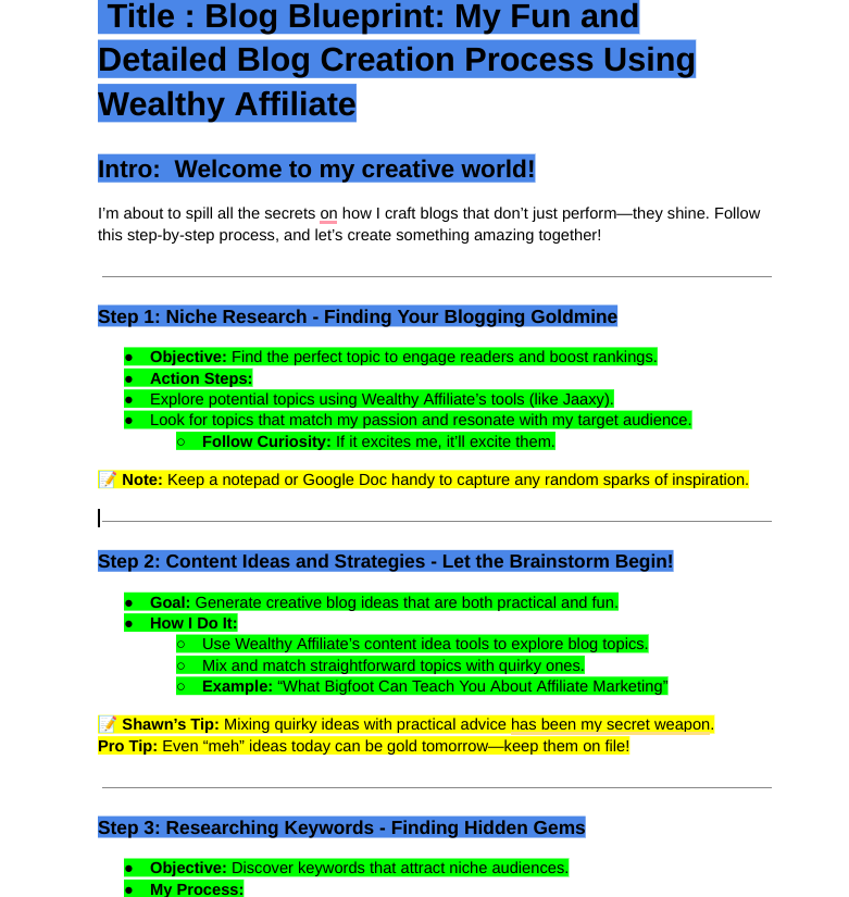 - Collect All the Research: Competitor blogs, keyword lists, possible CTAs—it all goes into my Google Doc.
