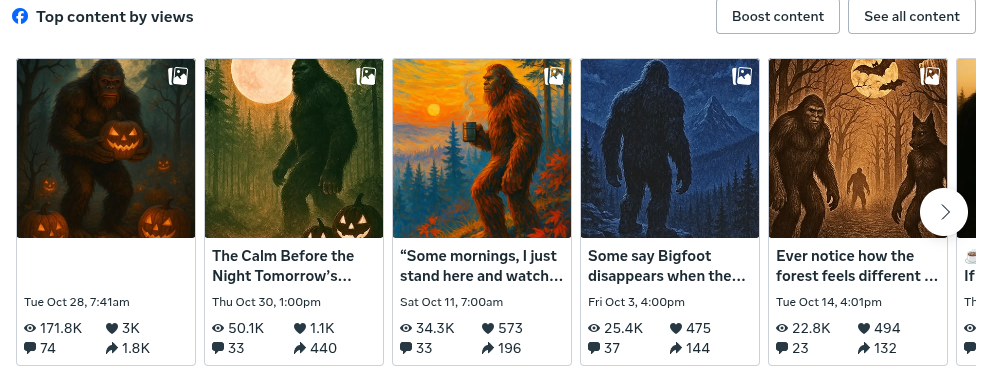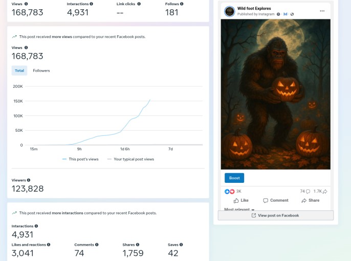 Just Bigfoot under a harvest moon, holding a jack-o’-lantern an image from an old post that had done well before. And with Halloween in the air, it just felt right.