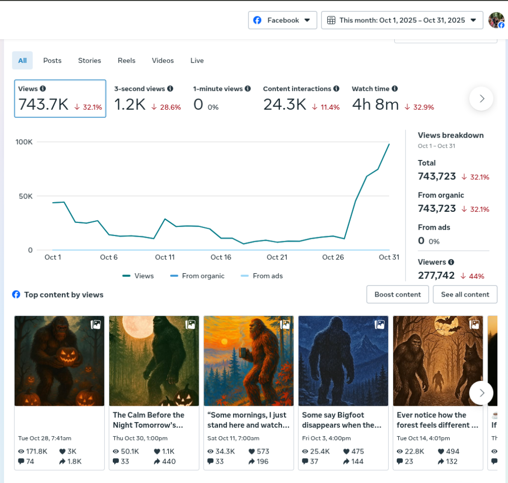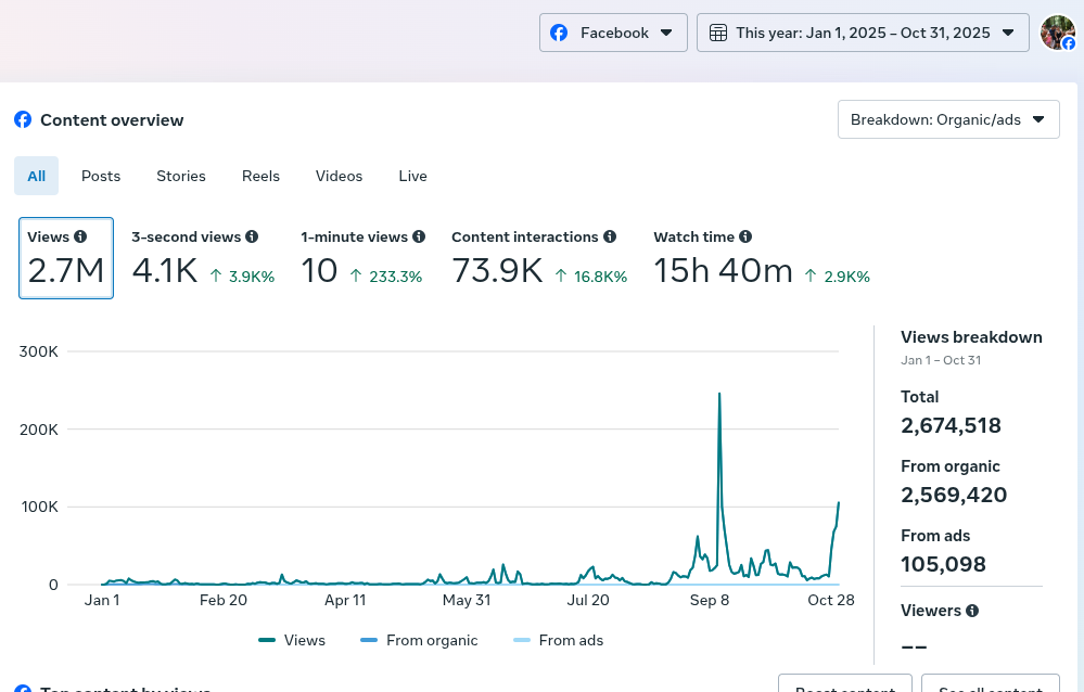 Since January 2025, Wildfoot Explores has crossed 2.7 million total views, with 2,569,420 of those completely organic no ads, no boosts, just storytelling. and only 105,098 view from a test ad that went no where