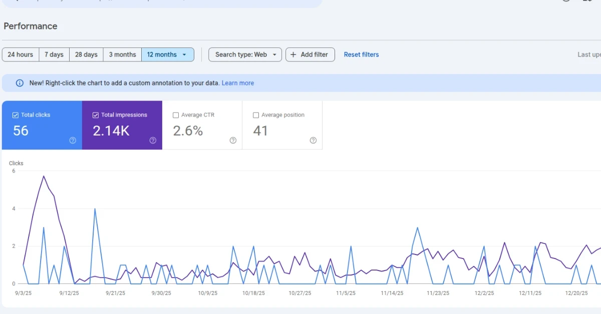 Google Search Console: 2.14k impressions / 56 clicks
