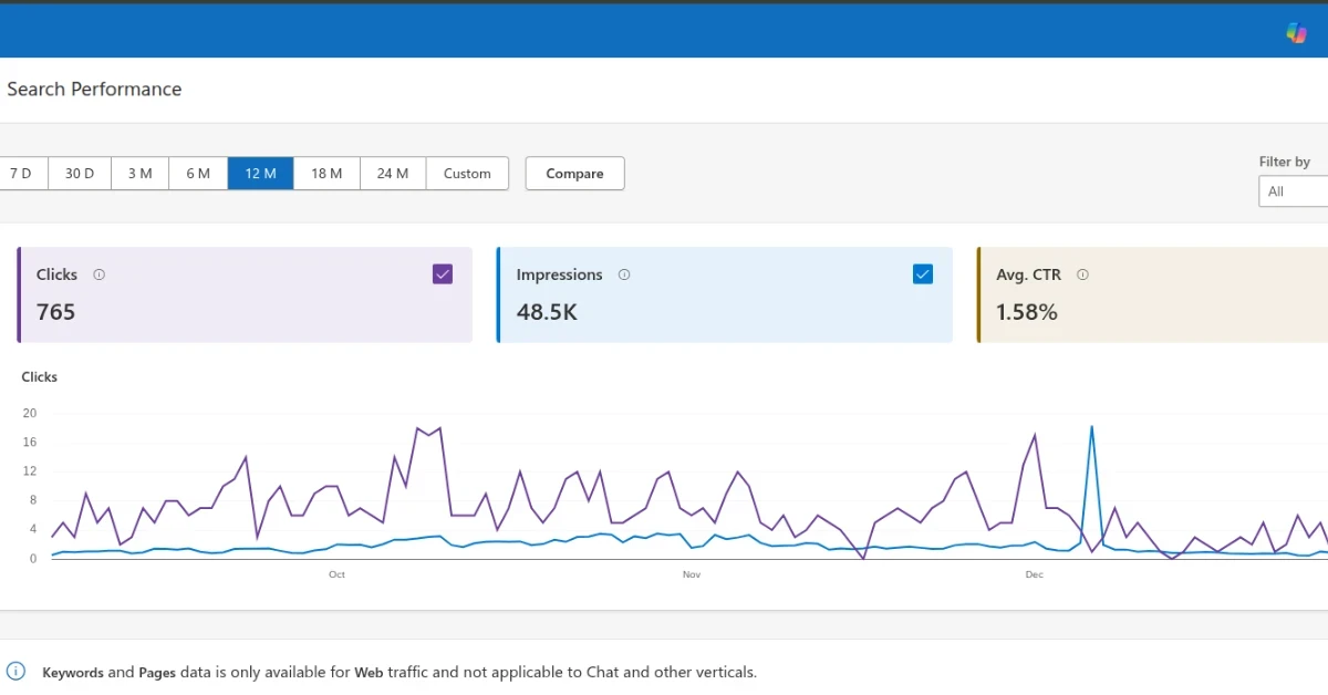 Bing Webmaster Tools: 48.5k impressions / 765 clicks