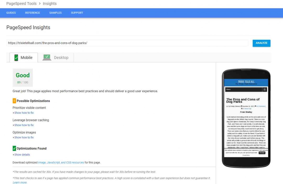 This will be a quick and simple article on How to Optimize Page Speed. I know there are many others more knowledgeable about this topic than I am, but I wanted to let everyone know that it really does work. I posted an article on my website yesterday about the Pros and Cons of Dog Parks. I added two photos. When I checked on my page speed, it was Desktop 70 and Mobile 84. That desktop really needed to be improved and the mobile could still use improvement. My site is new and needs all the help it can get to be seen. I went into my own photo software, Adobe Photoshop and opened the image. Then I saved it using the save for web and devices menu. As recommended by Jvranjes (Jovo), I set my width to 400 pixels. I did not have a compression size to chose other than small, medium and large. I selected medium. I could see the size of my images decrease. I then added the photos back into the media library and added the first photo into my post and removed the original photo.