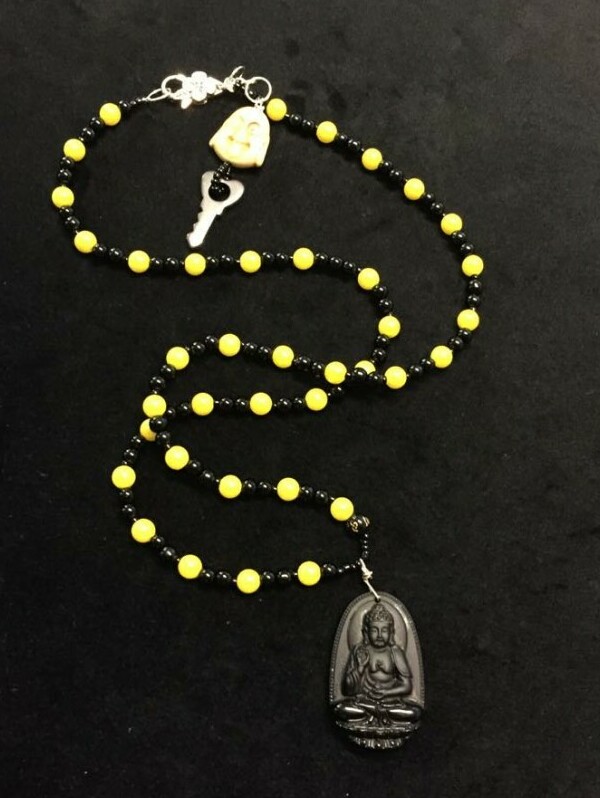 I broke a Buddha necklace made with black Obsidian gem beads a week ago. So I recently remade it using some yellow beads.