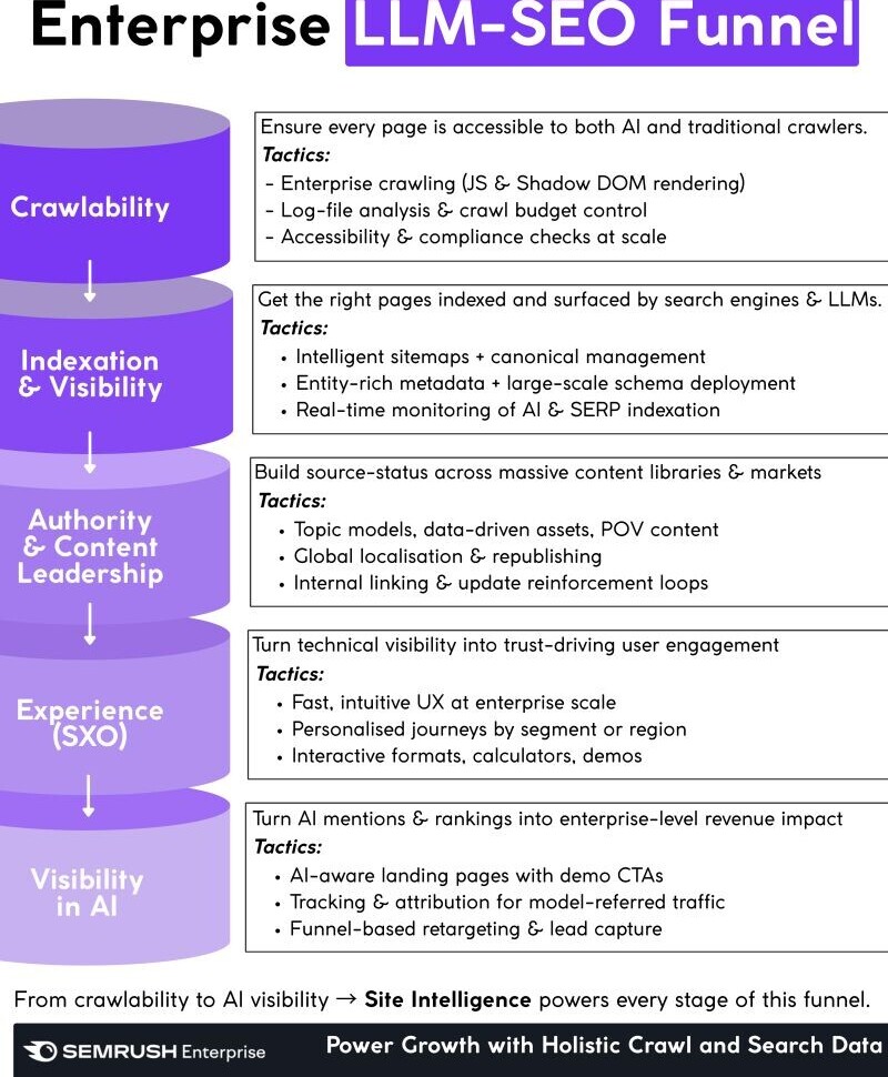 This diagram shows the Enterprise LLM-SEO Funnel. It is a breakdown of how a large company can get its content by both traditional SEO engines like Google and new AI systems like ChatGPT. It is basically a step by step guide to making sure your website is not only technically sound, but also authoritive and engaging.