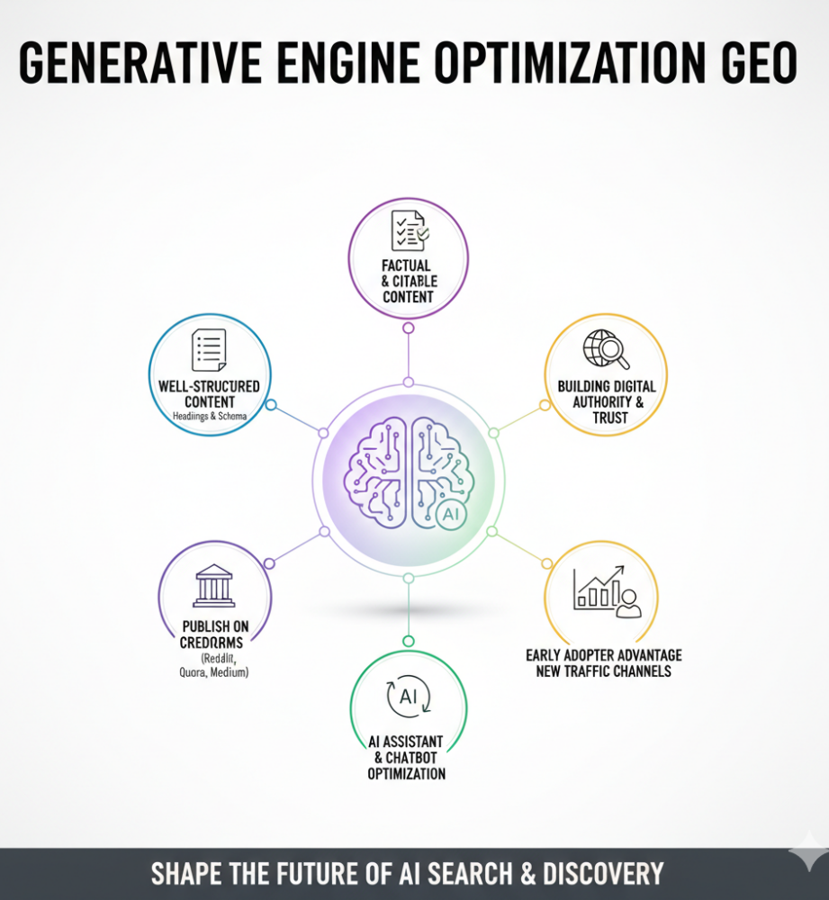 Generative Engine Optimization (GEO) is the newest frontier , focusing on how content is used by AI driven search engines and chatbots. It is the process of optimizing content to be cited or summarized by generative AI models like ChatGPT , Perplexity or Google's search generative experience.