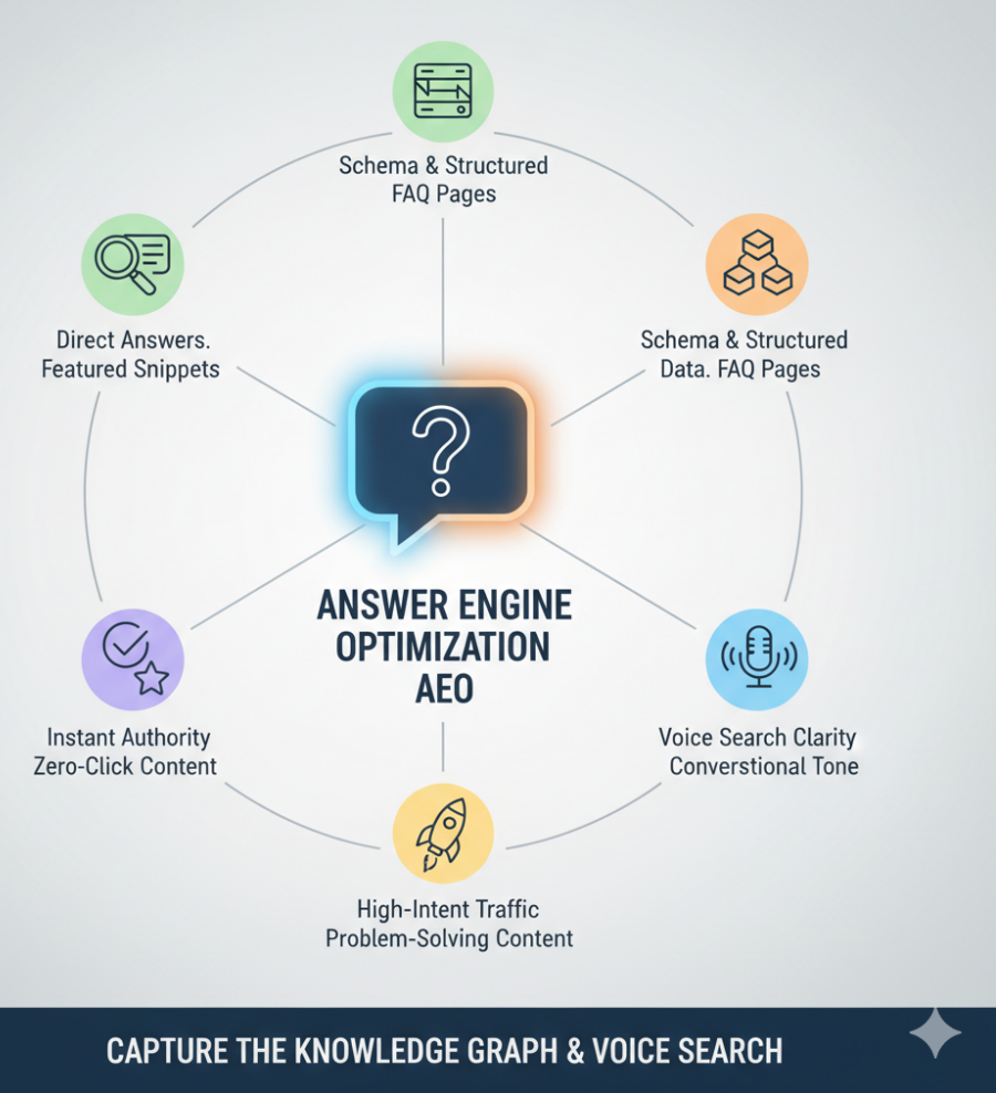 Answer Engine Optimization (AEO) focuses on capturing "zero-click answers" , often referred to as featured snippets. It is about optimizing content to be concise , clear and directly answer user questions , so that it can be pulled by search engines for answers at the top of the results page .