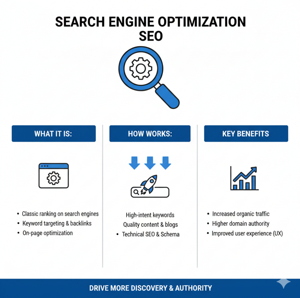 Pros include providing a proven, steady source of traffic and builds long-term authority . It also underpins the efforts for both AEO and GEO. Cons are that SEO is highly competitive and can be slow to show results. The system is vulnerable to algorithm updates and requires ongoing content and technical maintenance.