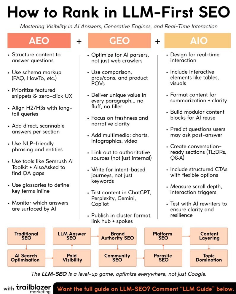This excellent diagram from Trailblazer Marketing provides a framework for mastering visibility in the age of AI search engines , which they call LLM SEO. The main idea is that traditional SEO isn't enough anymore . You need to create content that is not just optimized for a search engine , but for an AI that answers questions directly. The core message is: "The LLM SEO is a level up game, optimize everywhere, not just Google".