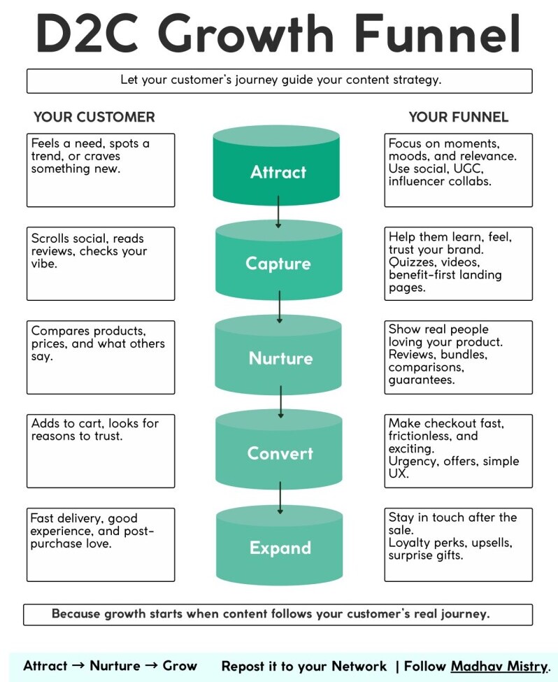 This diagram, another fantastic one from Madhav Mistry, lays out a simple yet powerful framework for Direct-to-Consumer (D2C) brands. The core idea is that a successful D2C growth strategy hinges on a deep understanding of the customer's journey. As the diagram states, "Because growth starts when content follows your customer's real journey."