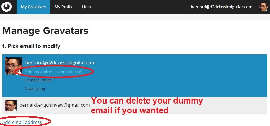Once you're in Gravatar, you can add the email you like, set it as the primary email, and delete the dummy email if you like.
