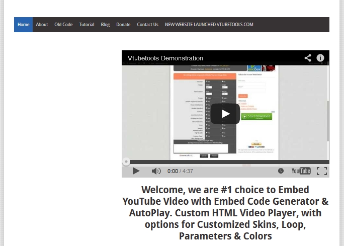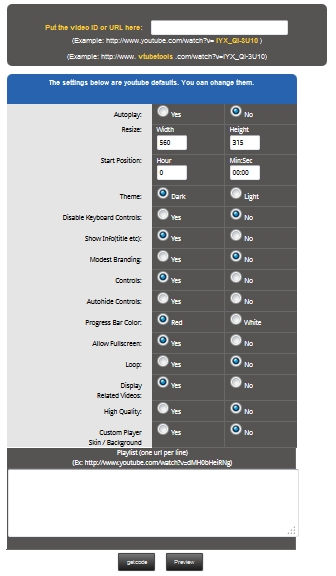 Would you like autoplay on your you tube videos, maybe resize them, change the starting position, put the theme lighter, enable keyboard controls, turn off the title, show modest branding, turn the controls off, autohide the controls, maybe have the progress bar white instead of red, maybe you don't want to allow fullscreen, have a loop and disable the related videos at the end, would you like it in high definition or just customize the player, well you can do all of that at V Tube Tools, it`s easy and it's free!