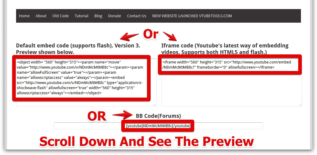 If you select get code you will be able to choose 3 types of codes and if you scroll down the page you'll be able to see the video preview as well.