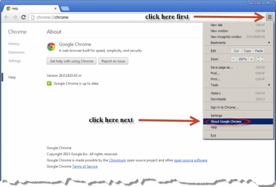 For Chrome, it is a little more time to find the about, since it’s on the far right side button. Yes, that square thing is a button! I didn’t even know that when I first started out on Chrome, actually. Here is where you click to get to the version for Chrome: