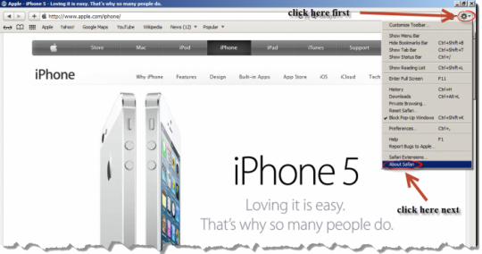 When I open a window within the Safari browser, the very right corner is not the location of the About Safari pull down as you picture.