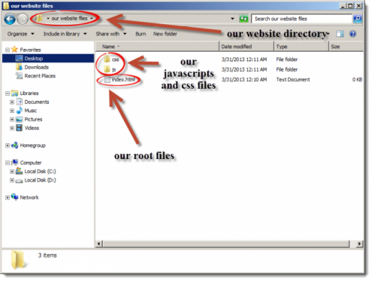Last time we talked about the fact that there is Firefox, Chrome, Internet Explorer, and Opera in our last article. We are now on Chrome, Internet Explorer, and Safari -- yes, I mentioned Safari! More on that later.We discussed that we need these to test all of our JavaScript files, which as you remember, resides as a “.js” file on your hard drive. My recommendation is to put these into a “JS” directory, if you will be using lots of script files to have a cleaner file system. These include CSS files if you use them, as well. I usually put them in a CSS directory. Here’s an example (this was on Windows 7. Your interface may look a bit different):