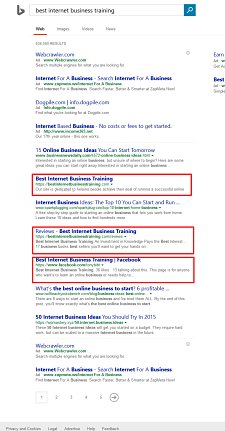 There is one review I wrote about business books that also comes up at No4 in Bing (see photo below) when searching for my Long Tail Keyword/Domain Name. I am guessing this is because I have categorized it under 'Reviews' on my website as it shows up as 'Reviews - My Domain Name'. My Facebook page also shows up at number 5.