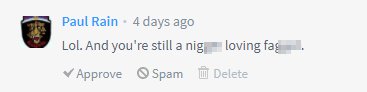Some people use a free speech argument for allowing everything that anyone types in aside from blatant robot spam. I couldn't disagree with that more. All opinions are welcome. But comments like the one below that I recently received? Not OK.