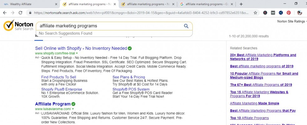 All good and well, but it seemed if Safesearch’s keyword suggestion feature is much reduced compared with Googles. To confirm my suspicions, I ran a little experiment. I compared a search on “Affiliate Marketing Programs” using both Google and Safesearch.