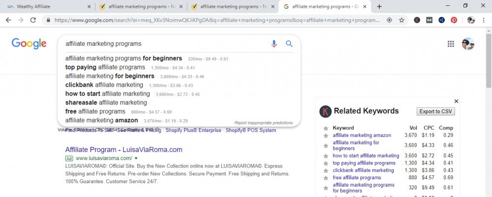 But more important even, Safesearch’s keyword suggestions ran out when I entered the 3rd word of my search phrase “affiliate marketing programs” whereas Google still had many suggestions left (please view the screenshots).