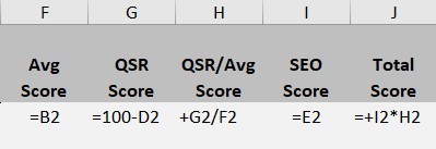 - QSR/Avg Score = Divide the QSR Score by the Avg Score. This reflects the number of websites receiving the actual number of searches each month. (So, for example, 6 websites receiving 50 searches a month will be obviously better than 100 websites receiving 50 searches a month. It is not so clear however if you compare 6 websites receiving 50 searches a month against, say, 9 websites receiving 87 searches a month)