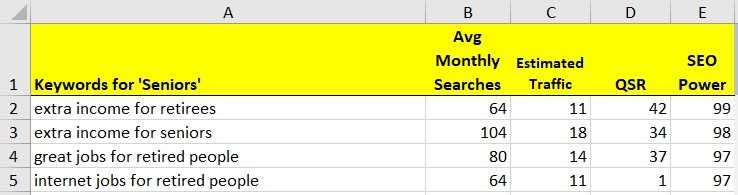 My particular niche is Options For Seniors To Make Money Online and I have entered a number of Keywords into Jaaxy for it and some examples of the results are: