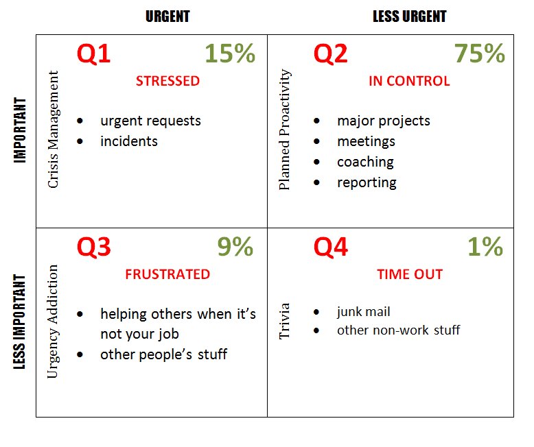 The matrix above is called the Time Management Matrix. What's important to understand is quadrant Q3. This is where most people spend their time and they really shouldn't because this quadrant represents other people's issues. Obviously there needs to be a balance, but that's where planning comes in. You need to plan your time to accommodate other people's issues which are urgent to them, but less important to you.