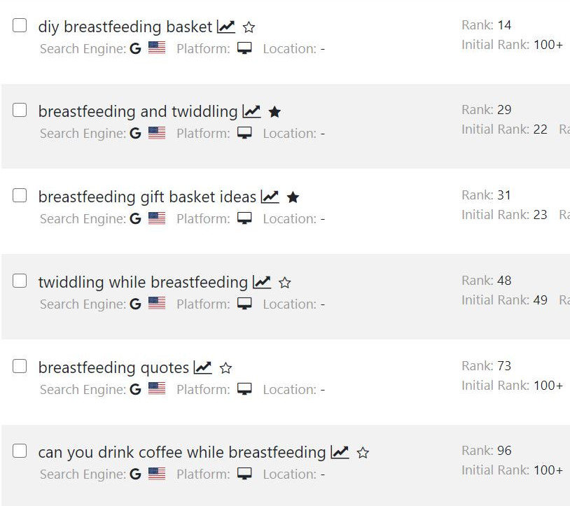 For a long time I had 2 general keywords I was ranking for under 100. DIY Breastfeeding Basket / Breastfeeding Gift Basket Ideas which hovered around 20-30 for quite a while. Then I had Breastfeeding and Twiddling / Twiddling while Breastfeeding hovering around rank 30-50.