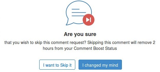So I decided to "Skip" this one, upon which I received a message to the effect that if I continued with the "Skip" process I would lose 2 hours from my comment boost status.