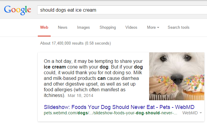 I was doing a Google search earlier and came across one of those things that make you go, hmmm. It wasn't keyword research this time. A friend of mine posted a video of her dog eating ice cream and I wondered how good of an idea this was. So I Googled it.