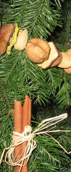 The red berry limbs of the Firethorn and Holly, the fresh pine boughs and cones, and the rose hips from the roses. Fresh cinnamon sticks. Nuts, cranberries, popcorn, dried apples and oranges.