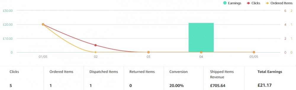 A few days ago I uploaded my April's report which was my third active month at WA. For the month of May I had set my goal to do better even if by a small margin. I am happy to tell you that in the 5th day of the month i achieved 2 goals. Firstly I made my first sale in Amazon UK and second the commision I earned was much more than what I have made from comissions in the first 3 months combined, adsense included. The picture below will show you the reality of things.
