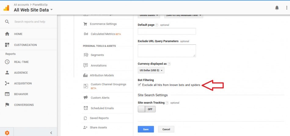 Once inside View Settings, scroll down to find Bot Filtering and check the box to filter out spiders: