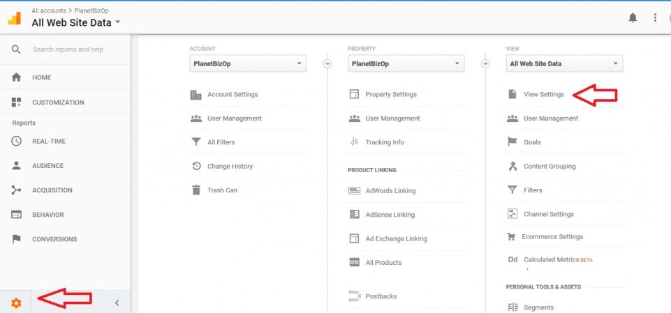 At the bottom of the Google Analytics left side menu click the gear icon and select View Settings. See below: