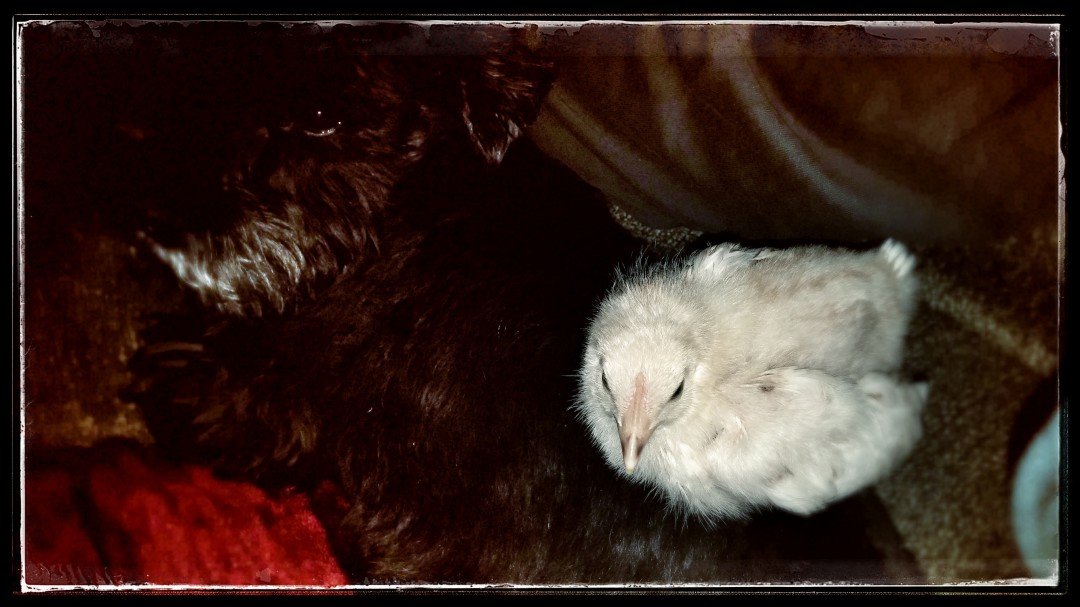 (Wait. Is that a chicken? On a dog? In the house? Well yes it is... that's a chicken that needs a DIAPER is what that is!)