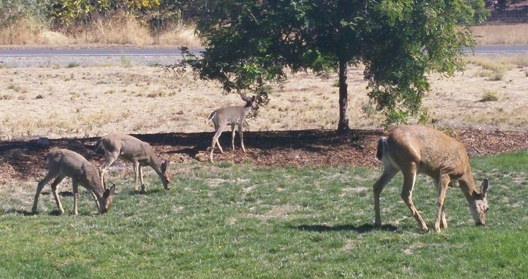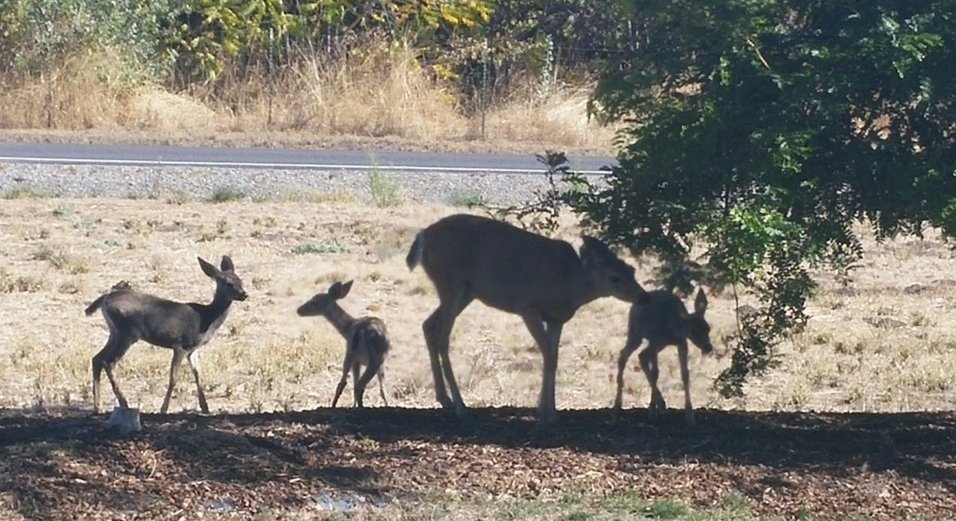 I try to keep them by the house, with the watering hole and throwing fruit out on the yard and stuff. Once they get near the road, they really like the big tree out there and I know that as cars approach they can't see them about to step out, like they could if they were strolling through the pasture. I may have to have a hack at that tree before next spring. And it's got plums on it that they love to reach up and yank out of the tree. It's pretty hilarious but a really bad spot. It's REALLY hilarious to see the giant-ass wild turkeys up in the tree shaking it, then falling out like a sack of potatoes HAHA -A