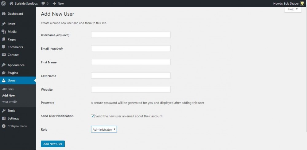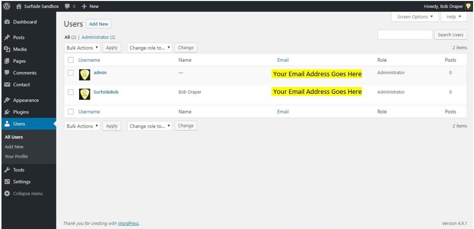 Once you've done this you'll have a new password generated and you can use this Username and Password to login to your site. (Please make note of this password. I keep all of mine saved in Excel.) Now every post you write will have this Authentic Name tied to the posts and not the Wizard of Admin behind the curtain. For the pages and posts you've created previously, you can go back and change the author name. Yesterday when I created the Surfside Sandbox site I created a new username and this is the screen that comes up.