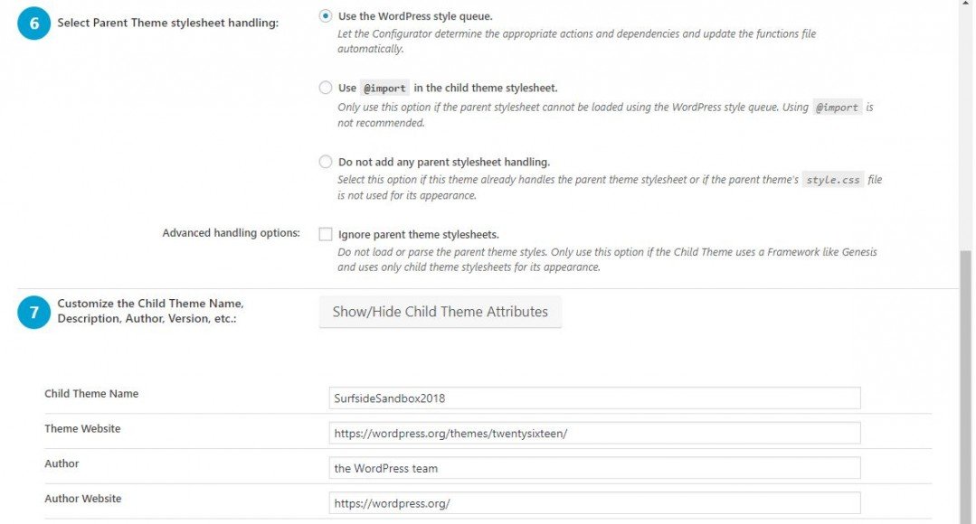 Once your site is analyzed, please proceed to the next section of the page, which looks like this. Allow the software to do the work, you don't need to do anything. However, you'll see that in Step 7 I first clicked the Gray Area that says "Show/Hide Child Theme Attributes." Then in the Child Theme Name, I changed it to "SurfsideSandbox2018." Again, let the unique person that you are carry through into ALL aspects of your life. You Are Built for Better.