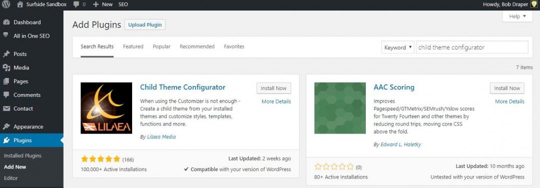 In your WP Dashboard, go to Plugins > Add New and then Search Child Theme Configurator. Then Click Install, and in a moment Click Activate.