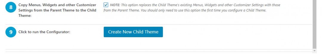 In this last page section, please note in #8 that I've clicked the box to Copy all Menus, etc. Please be sure to do this, as it will do a complete copy of the parent theme. Then all you have to do is click Create New Child Theme.