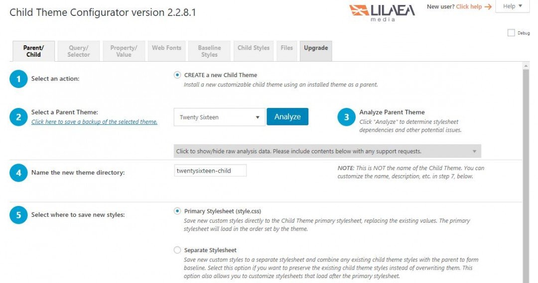 Once it's activated, go back to the WP Dashboard > Tools > Child Themes and this is the top of the window that appears. You'll see that it pulls up the theme I'm using, which on this site is 2016. All you need to do is click Analyze.