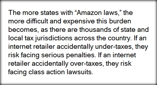 Amazon doesn't like this. They are in favor of some kind of compromise to establish a common practice across the country (Marketplace Fairness Act), but are not in favor of states individually deciding how to deal with online retailers. This is one of the reasons for their concern from that article from The Pelican Post:
