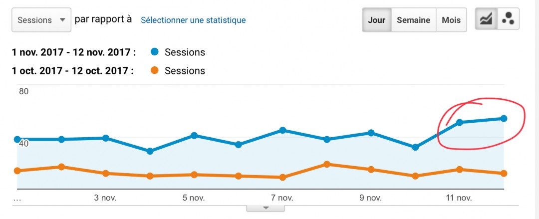 I was offline for a day and this afternoon, I just checked my Google Analytics to see where I was this month. I had the great surprise to see for the first time : it’s been 2 days that my organic traffic went up to 50 people a day. It’s a great deal for me as i see it’s improving a lot this month. So far in November, my organic traffic represent more or less 15% of my total traffic !
