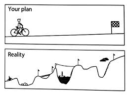 I love images. There is one I came across in the social media somewhere, that I like to keep in mind. How many times have we begun with some huge idea that we are all excited about, only to stop mid way, or even before mid way? My new favorite image which I speak of illustrates how we expect the plan to be a straight and narrow path to short time success, as long as our idea is good enough. But in reality, that path is full of valleys and rainstorms.