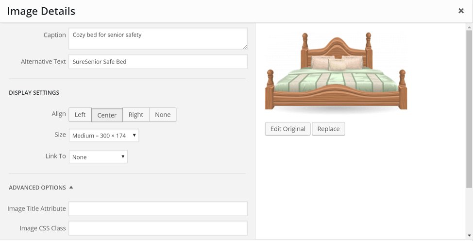 I always remembered that there was an ''Advanced Options" box to be found at the end of all the info boxes to fill in. Today I was re-visiting my images in older posts, (hence the bed image) and doing the proper SEO on them. When I right click on an image, right at the top of the image, icons appear. Second from the right, there is the little Edit pencil. When we click on this, a new box appears: