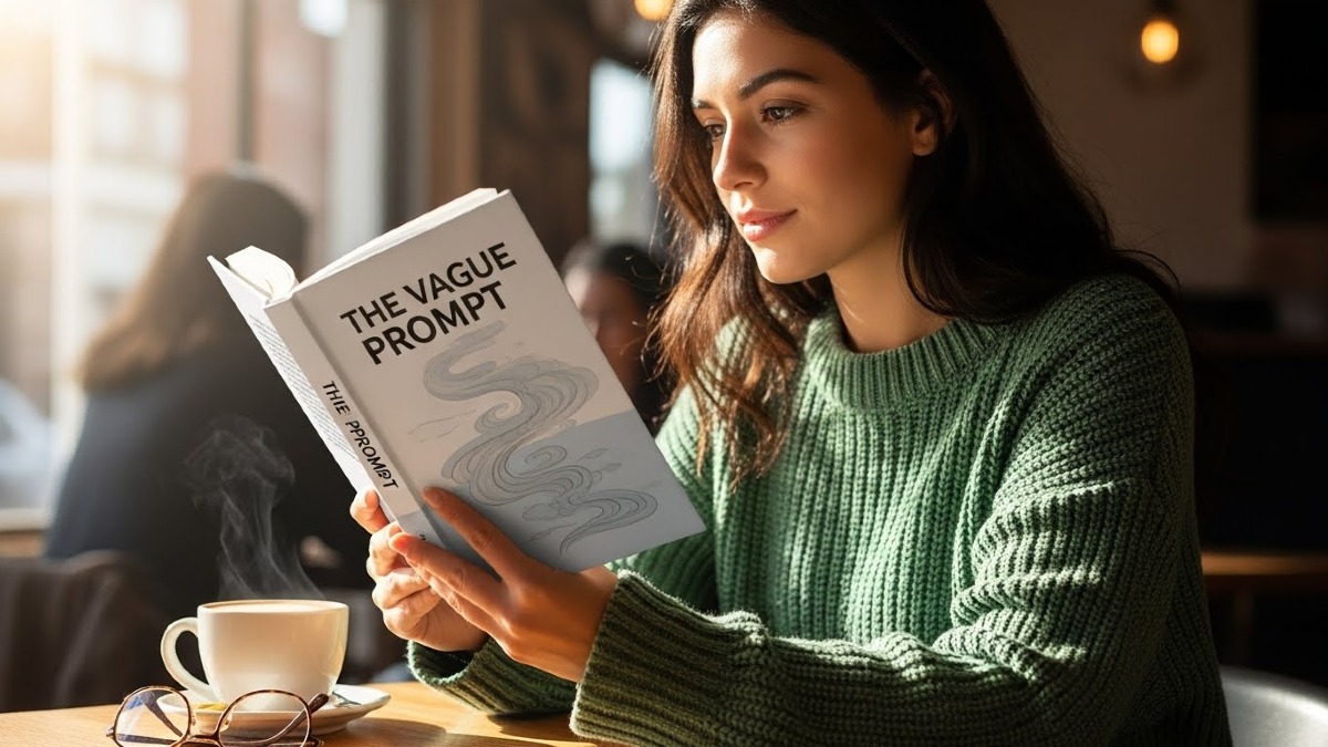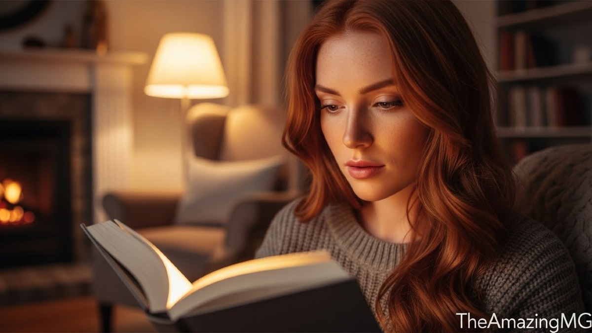 Clear prompt: “A Red-Headed woman reading a book in a cozy living room, warm light, close‑up, soft-focus photo style.”