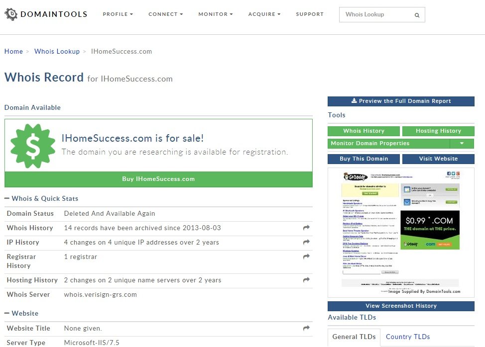 So you can see from the screenshot that "ihomesuccess.com" is available to register as a domain name. But it has been registered as a domain name before.